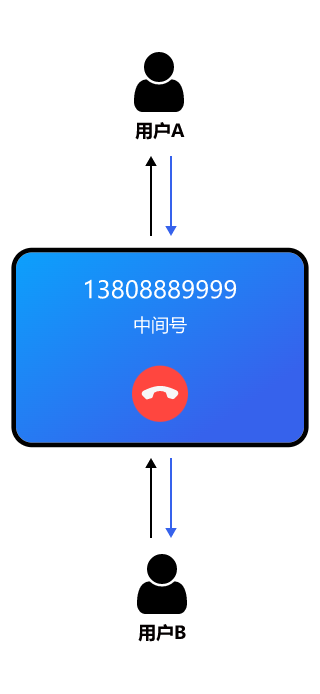 客戶分配中間號(hào)碼X,A撥打X與B通話,通話顯示X,其他號(hào)碼撥打無效,通話結(jié)束X失效。